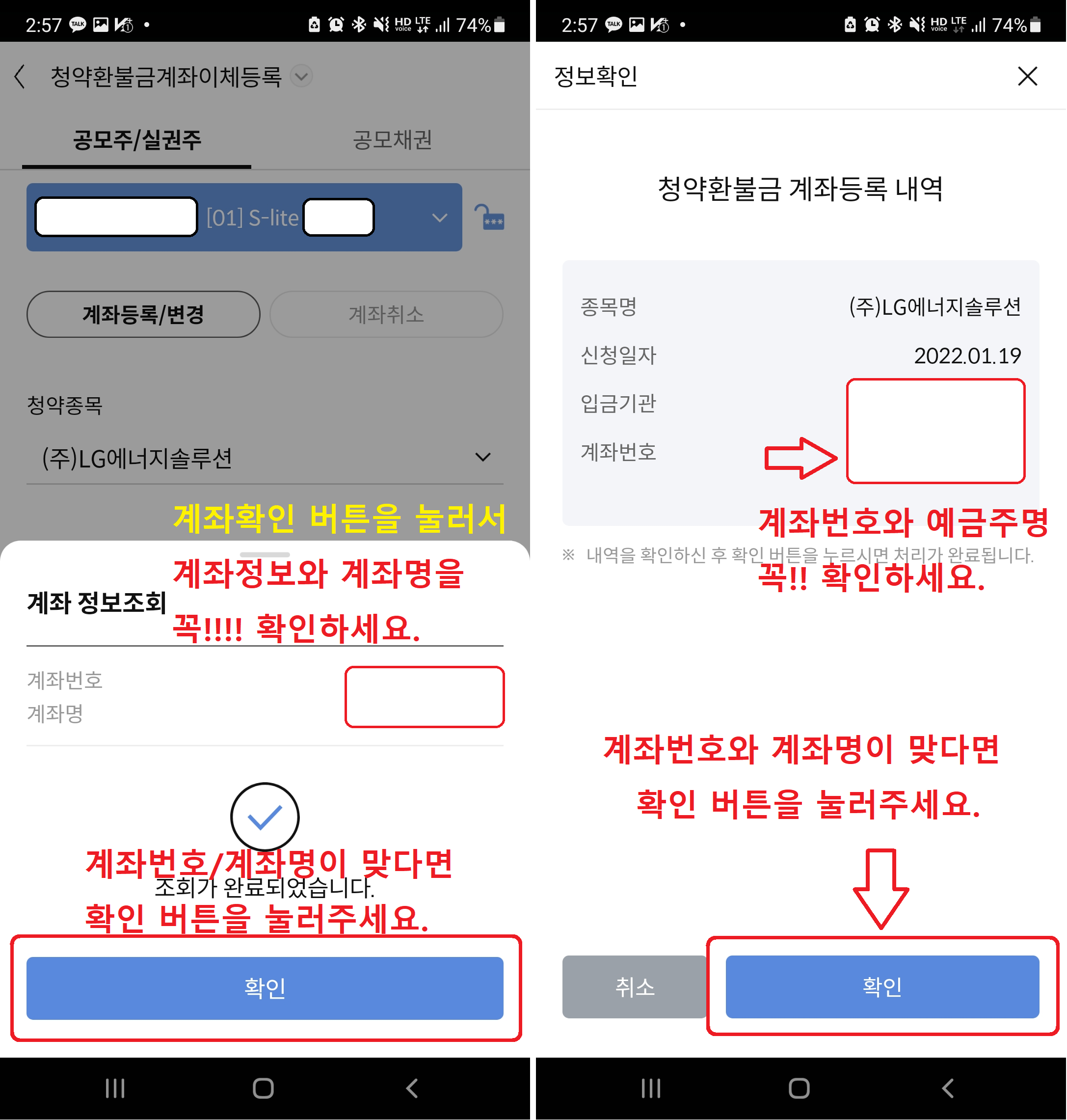계좌확인 버튼을 눌러서 계좌번호와 예금주명을 꼭!!! 확인하세요.