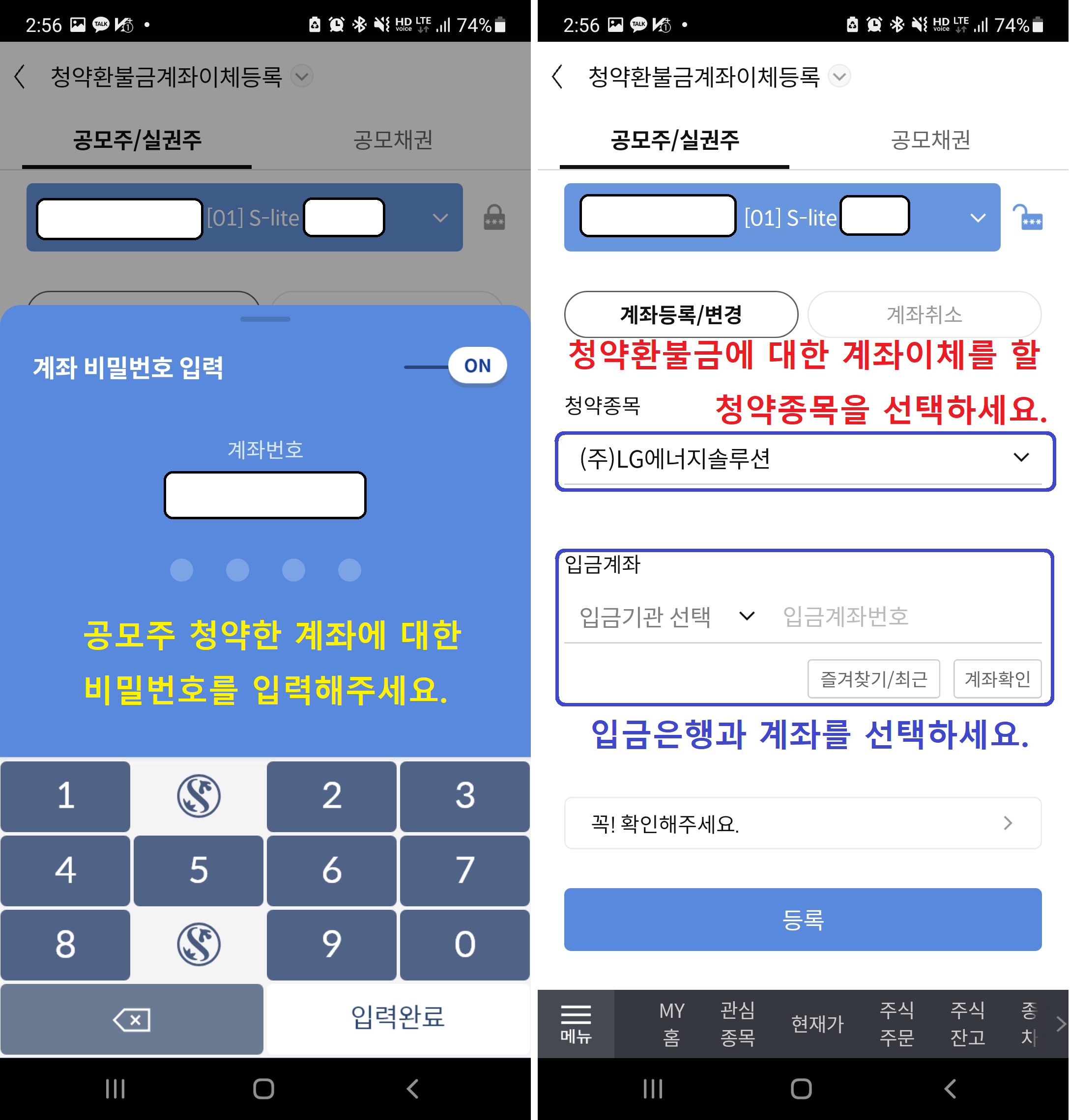 공모주 청약 환불금 계좌이체 등록이 완료되었습니다.
