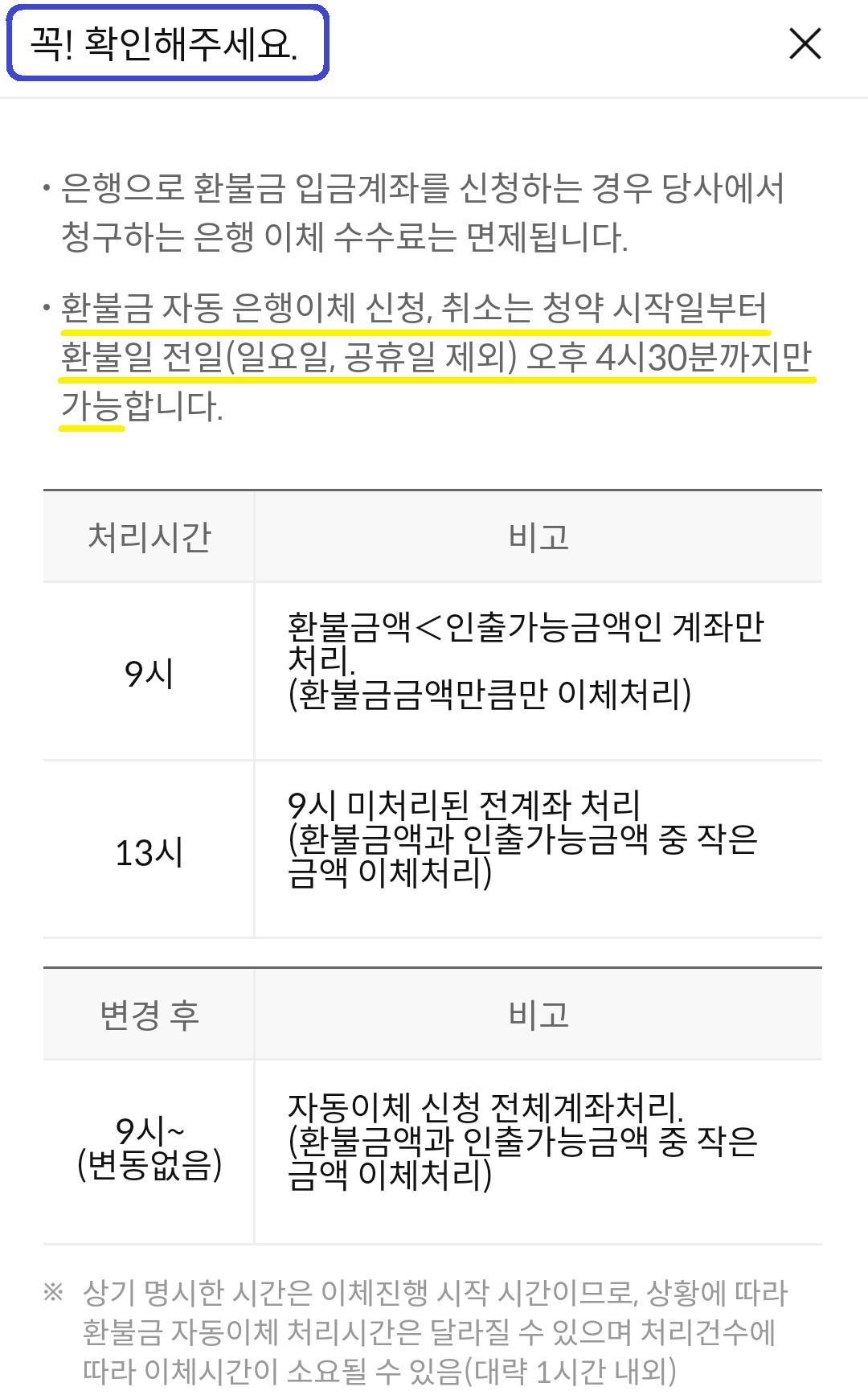 - 환불금 자동 은행이체 신청, 취소는 청약 시작일부터 환불일 전일(일요일, 공휴일 제외) 오후 4시30분까지만 가능합니다.