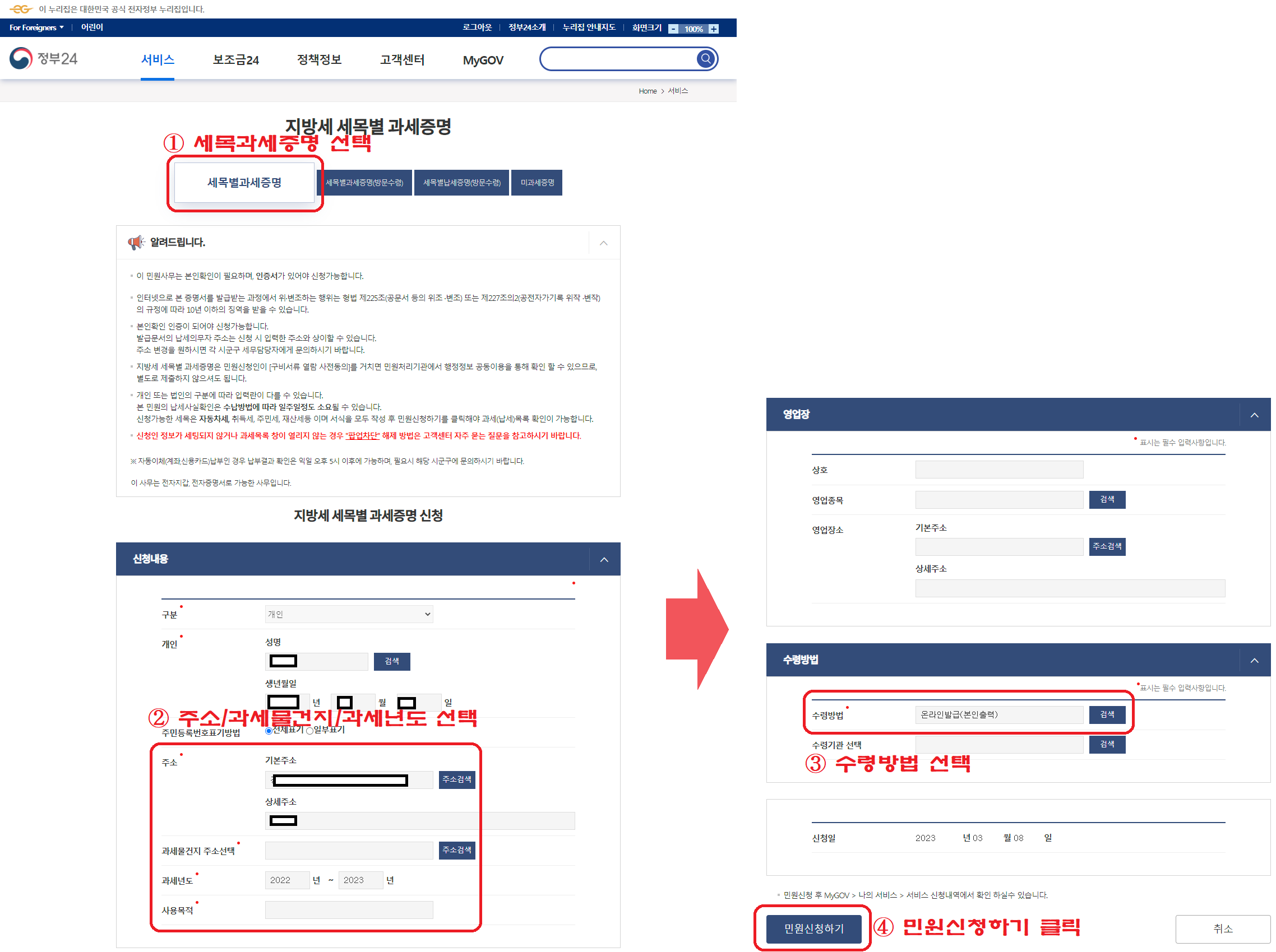 '세목별과세증명' 버튼을 클릭하시면, 아래와 같이 신청내용 / 영업장 / 수령방법 등을 선택할 수 있는 화면이 보여집니다.