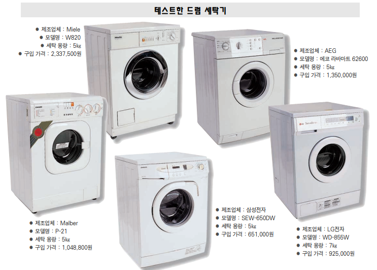 제한된 자료 일지라도 드럼 세탁기를 구입하려는 소비자들에게는 도움이 될 수 있다는 판단에 따라 드럼 세탁기 업체별 성능 비교를 실시하게 되었다. 성능 부분은 모두 표준 코스로 세탁하는 경우를 기준으로 한 것이다.