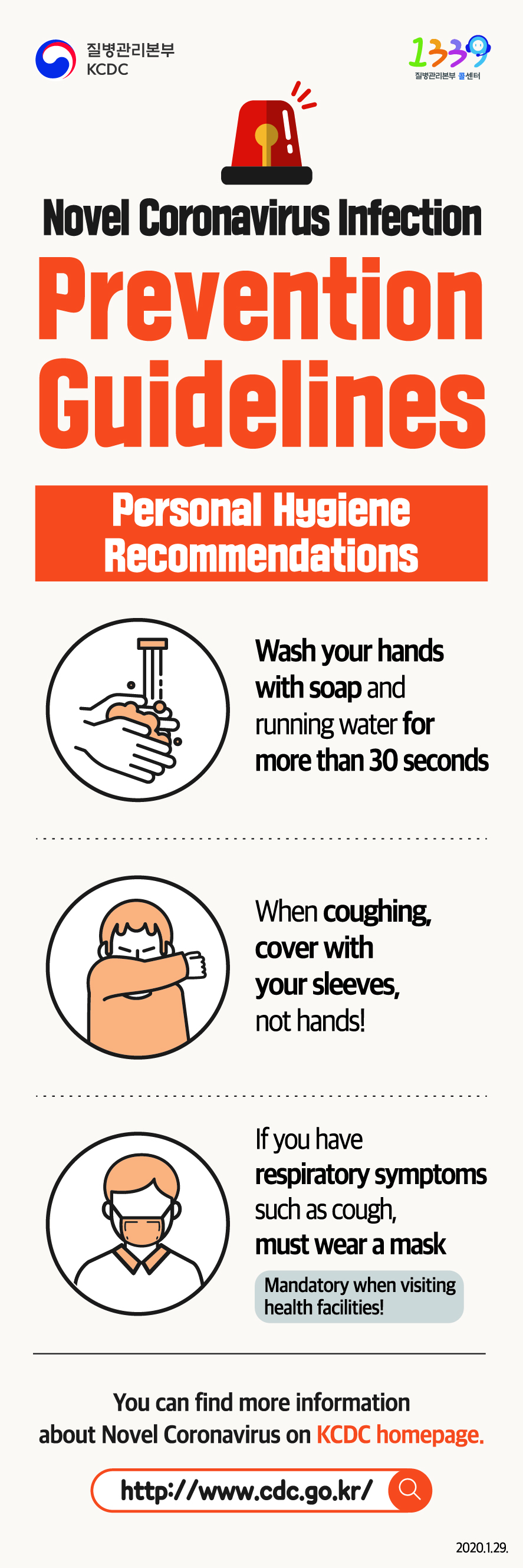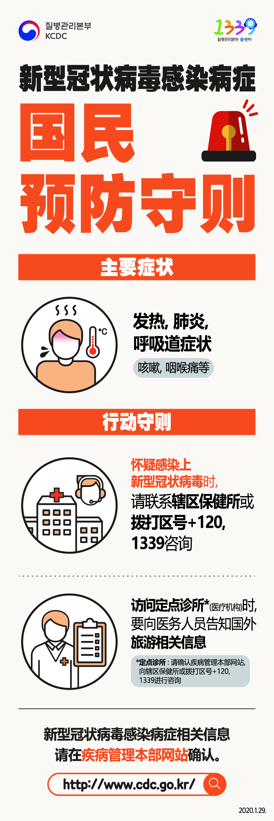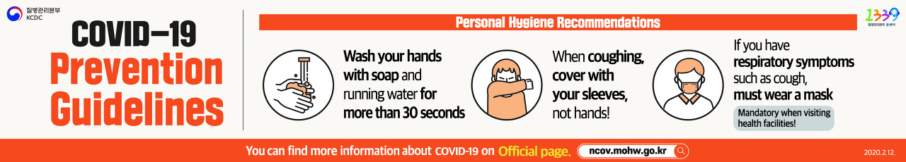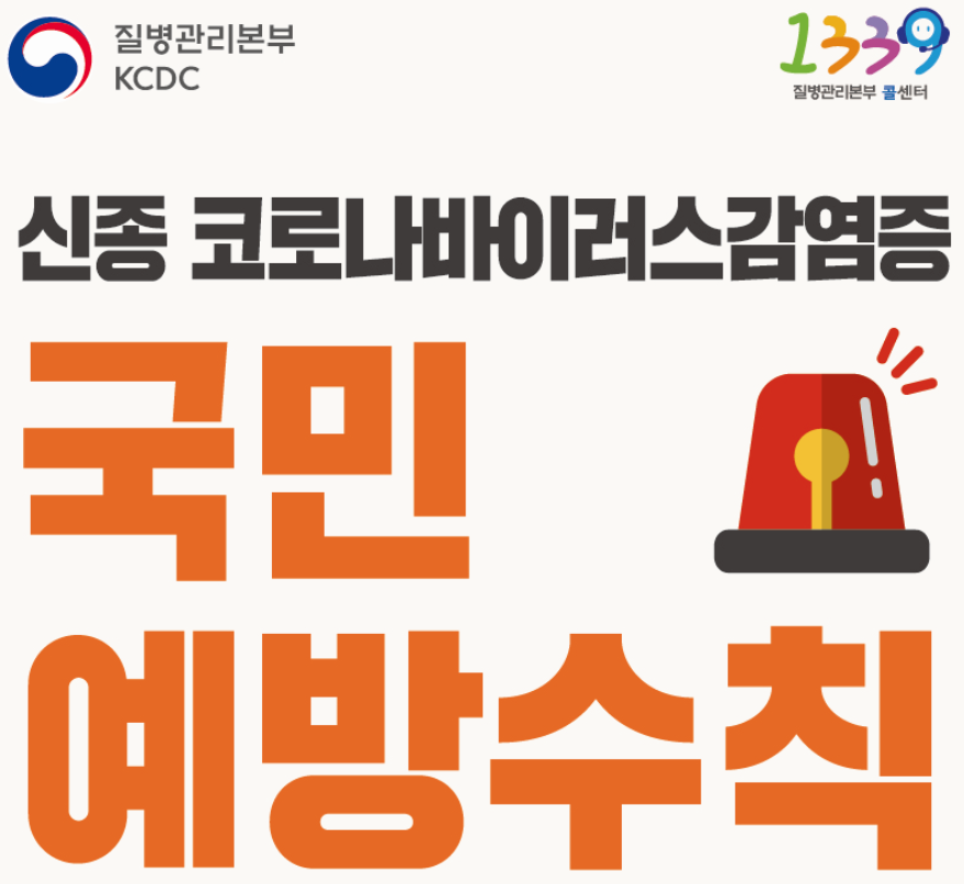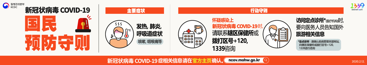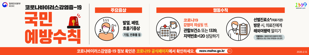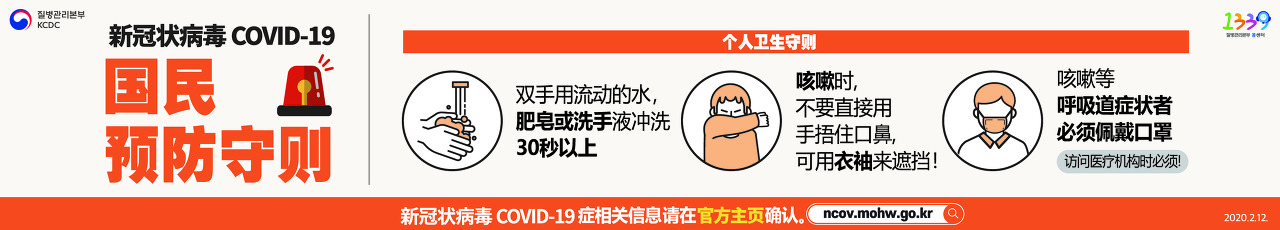 신종 코로나바이러스 감염증 국민 예방수칙 : 개인 위생수칙 - 흐르는 물에 30초 이상 비누로 꼼꼼하게 손씻기, 기침할 땐 손이 아닌 옷소매로!, 기침 등 호흡기증상자는 반드시 마스크 착용(의료기관 방문 시 필수!). 신종 코로나바이러스 감염증 정보확인은 질병관리본부 홈페이지에서 확인하세요. http://www.cdc.go.kr신종 코로나바이러스 감염증 국민 예방수칙 : 주요증상 - 발열, 폐렴, 호흡기증상(기침, 인후통 등), 행동수칙 - 신종 코로나바이러스 감염이 의심될 땐, 관할보건소 또는 지역번호+120 1339 상담하기, 선별진료소*(의료기관) 방문 시, 의료진에게 해외여행력 알리기 (*선별진료소 : 질병관리본부 홈페이지 확인, 관할보건소 또는 지역번호+120, 1339 문의) 신종 코로나바이러스 감염증 정보확인은 질병관리본부 홈페이지에서 확인하세요. http://www.cdc.go.kr신종 코로나바이러스 감염증 국민 예방수칙 주요증상 - 중문신종 코로나바이러스 감염증 국민 예방수칙 주요증상 - 영문