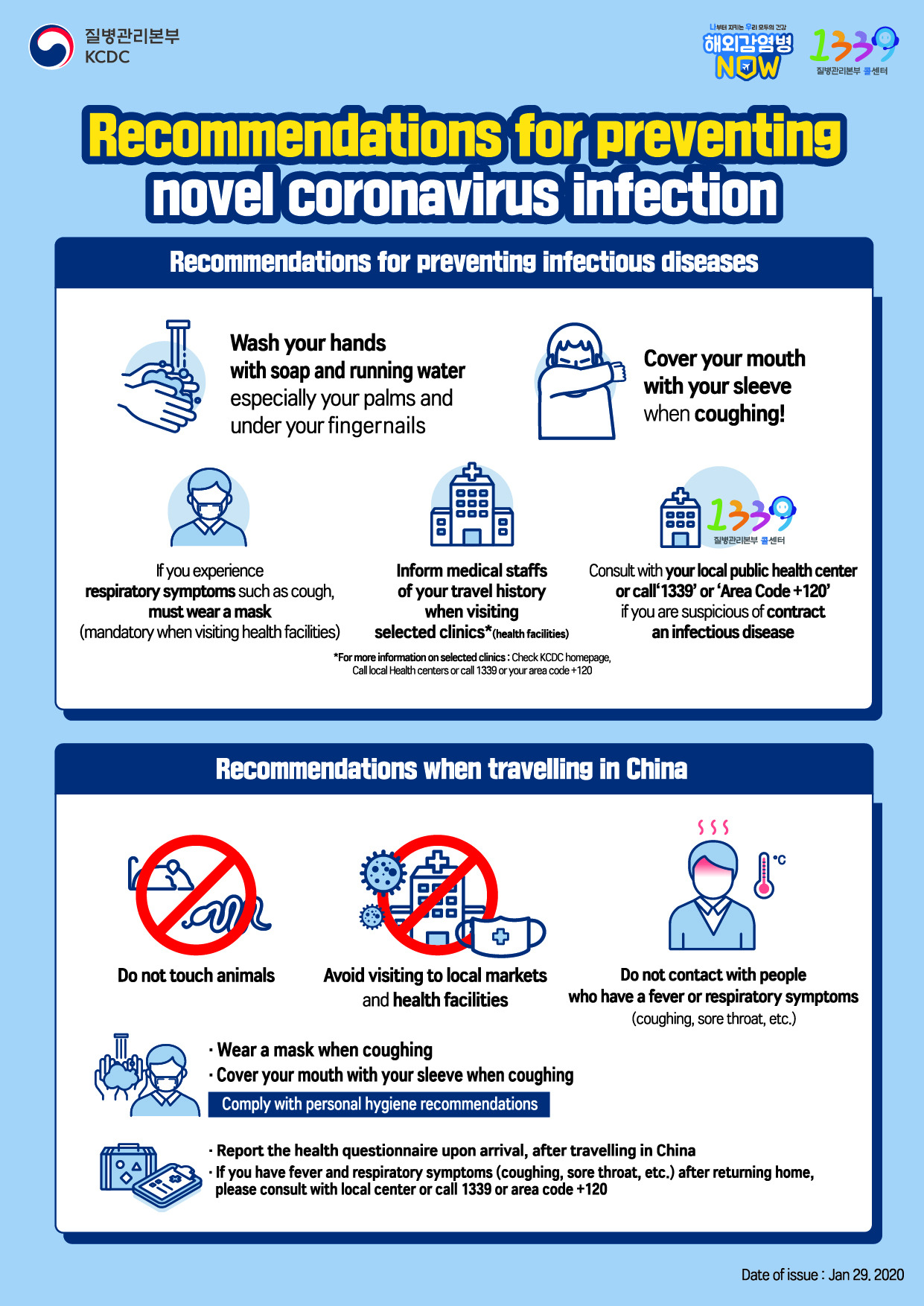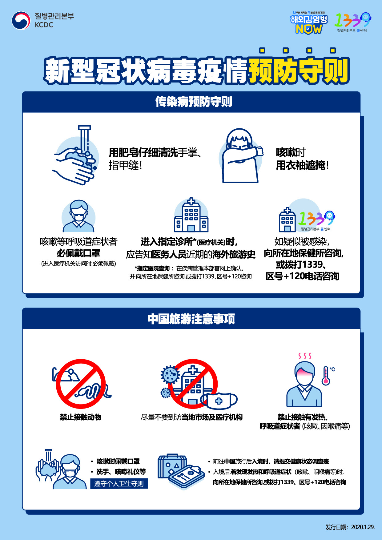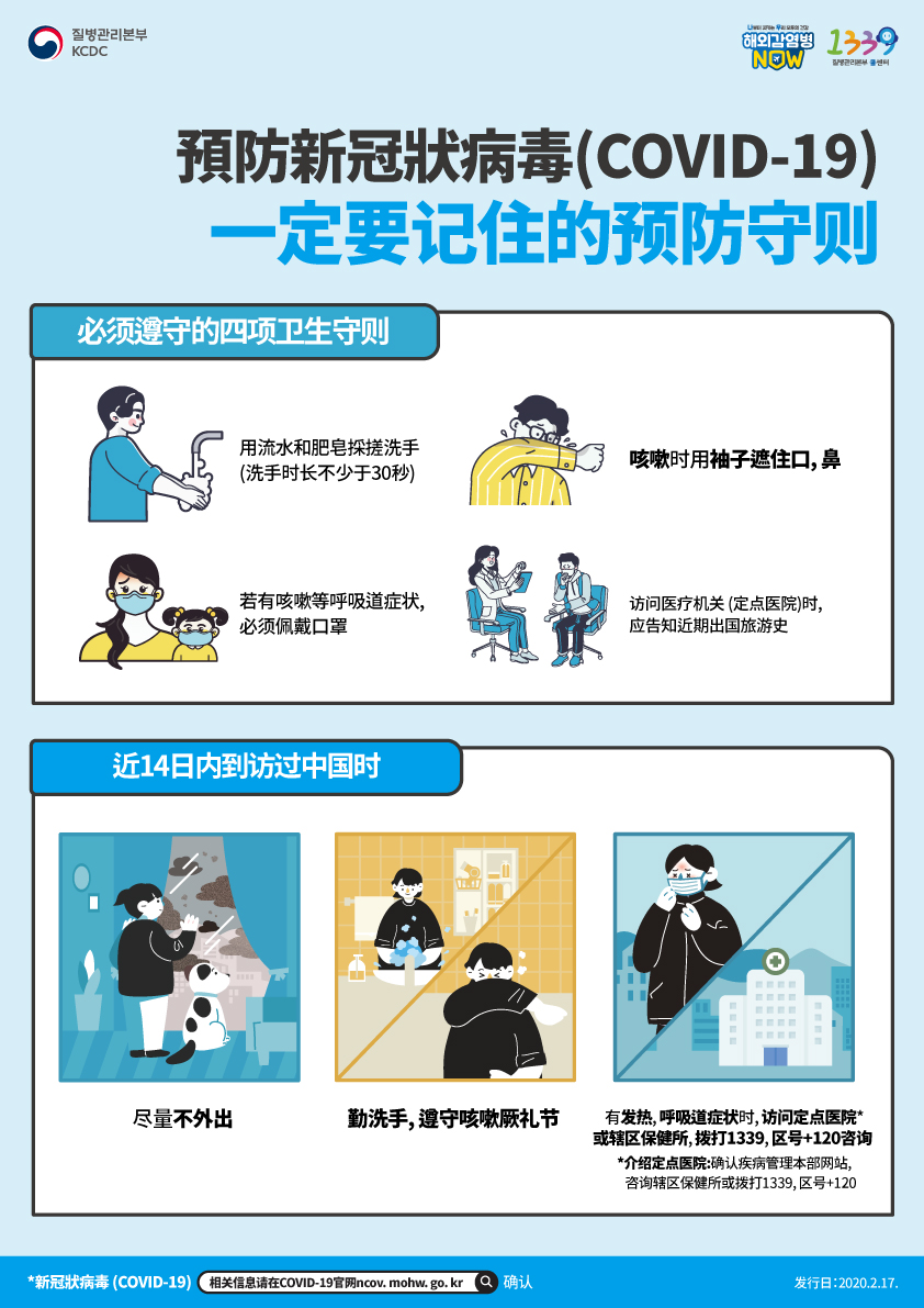 신종 코로나바이러스감염증 예방수칙 (국문) - 감염병 예방수칙 : 손바닥, 손톱 밑 꼼꼼하게 손 씻기, 기침할 땐 옷 소매로 가리기, 기침 등 호흡기 증상자는 의료기관 방문 시 반드시 마스크 착용, 의료기관 방문 시 의료진에게 해오여행력 알리기, 감염병 의심될 땐 질병관리본부 콜센터 1339 상담. - 중국 유행지역 여행 시 주의사항 : 동물(가금류 포함) 접촉 금지, 현지 시장 및 의료기관 방문 자제, 발열/호흡기 증상자(기침, 호흡곤란 등) 접촉 금지, 기침 시 마스크 착용, 손씻기, 기침예절 등(개인위생 수칙 준수), 중국 여행 후 입국 시 건강상태질문서 제출, 귀국 후 발열과 호흡기 증상(기침, 인후통 등) 발생 시 관할보건소 또는 질병관리본부 콜센터 1339, 지역번호+120 상담