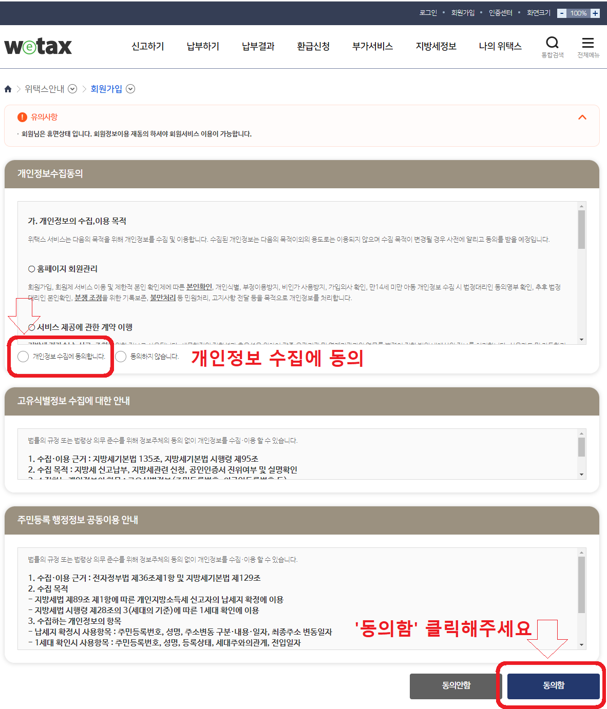 회원가입을 위해서 개인정보 수집에 동의 체크해주시고,