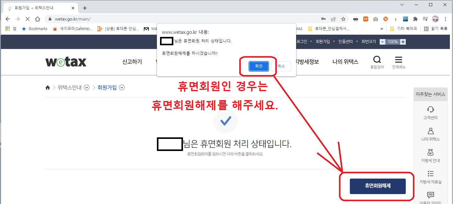 이름과 주민번호를 입력하시고 '확인' 버튼을 눌러주세요.
