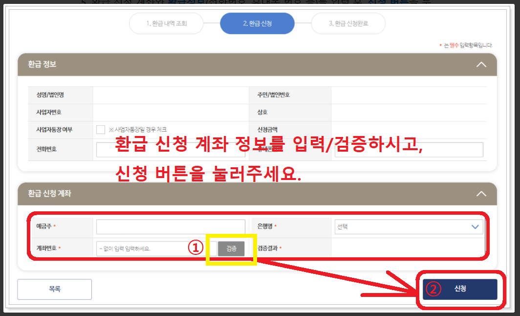 환급 계좌 정보를 입력하신 후 '신청' 버튼을 클릭하세요.