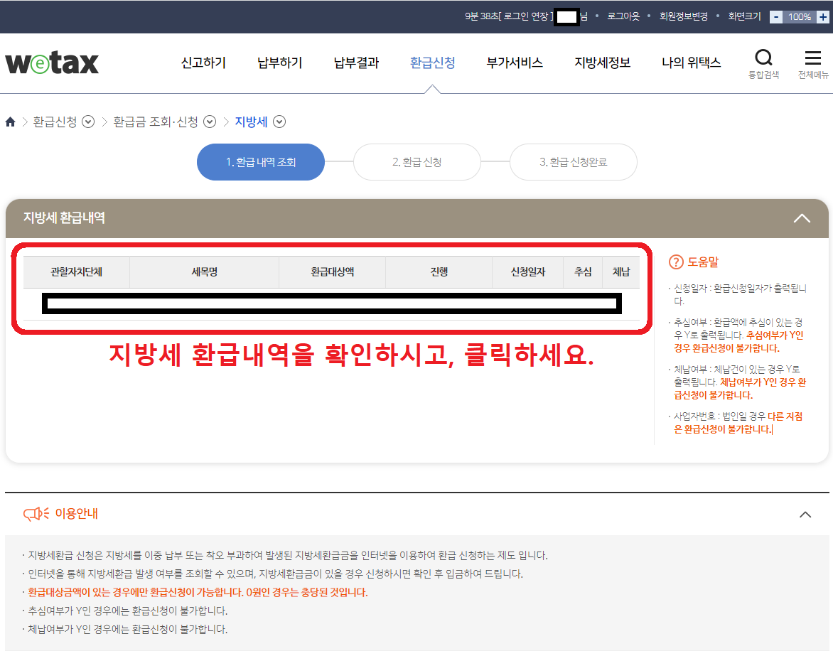 지방세의 상세내역을 확인하시고, '환급신청' 버튼을 클릭하세요.