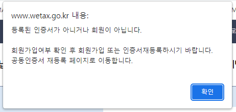 비회원이거나 인증서가 미등록되어 있을 경우에는 아래와 같은 팝업창이 뜹니다.