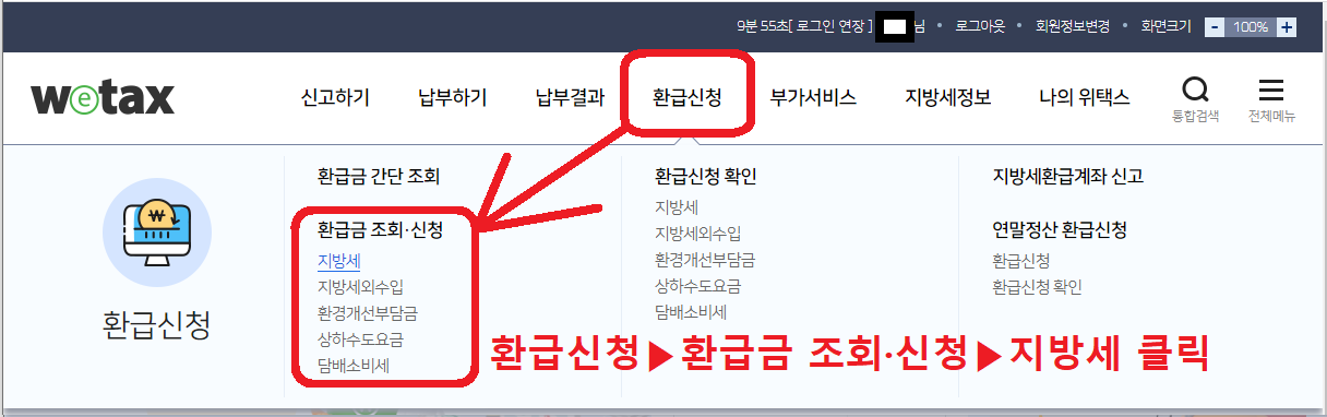 상단의 메뉴에서 [환급신청] ▶ [환급금 조회·신청] ▶ [지방세] 메뉴를 클릭하세요.