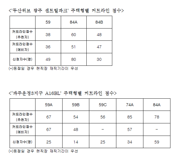 (발표) 중소기업장기근속자 주택특별공급 커트라인 안내 (두산위브 광주 센트럴파크, 파주운정3지구 A16BL)