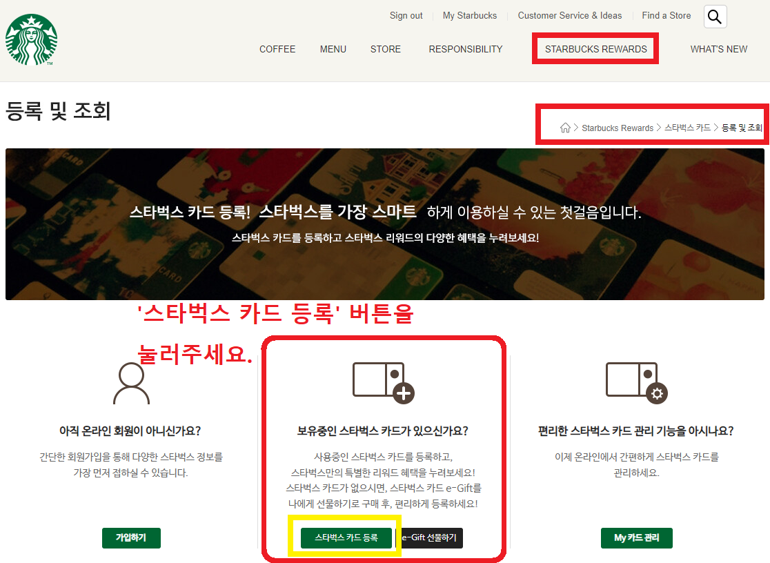 홈 > STARBUCKS REWARDS > 스타벅스 카드 > 등록 및 조회