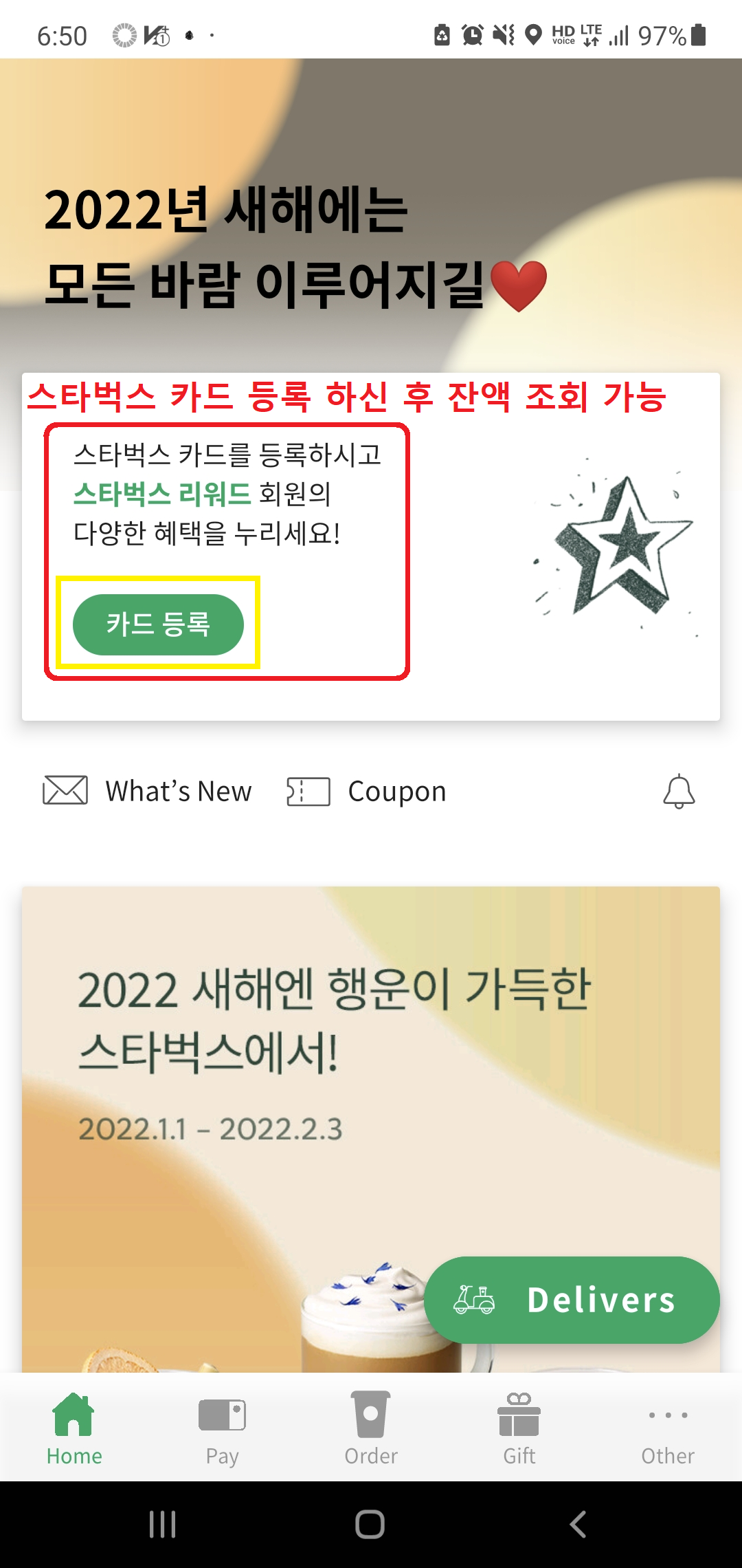 '카드 등록' 버튼을 눌러서 스타벅스 카드를 등록해주세요.